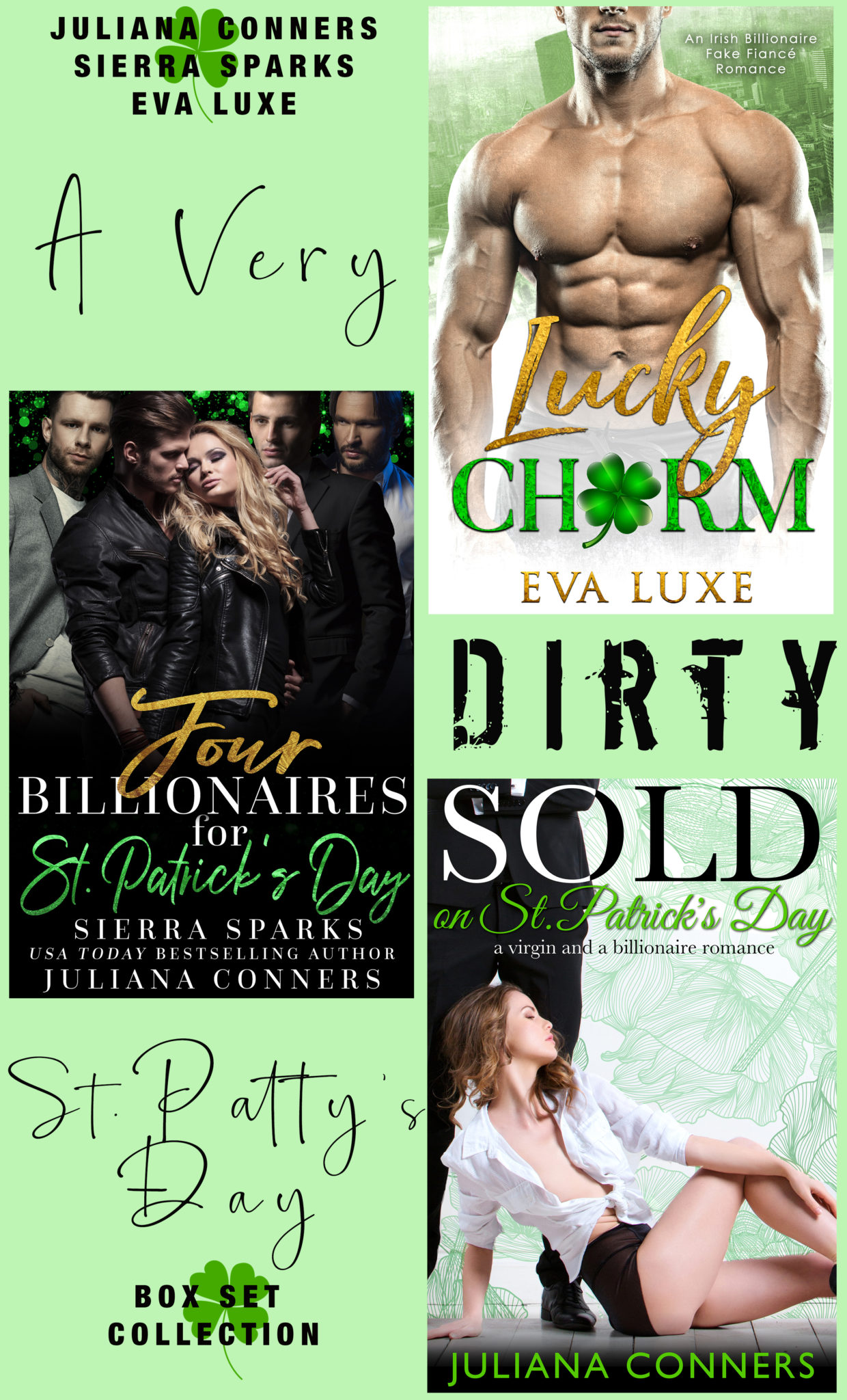 A Very Dirty St. Patty’s Day is an anthology of three standalone St. Patrick’s Day romance books (Lucky Charm by Eva Luxe, Four Billionaires for St. Patrick’s Day by Sierra Sparks and Juliana Conners, and Sold on St. Patrick’s Day by Juliana Conners) featuring alpha male, bad boy billionaires and the curvy, feisty women who win their hearts.