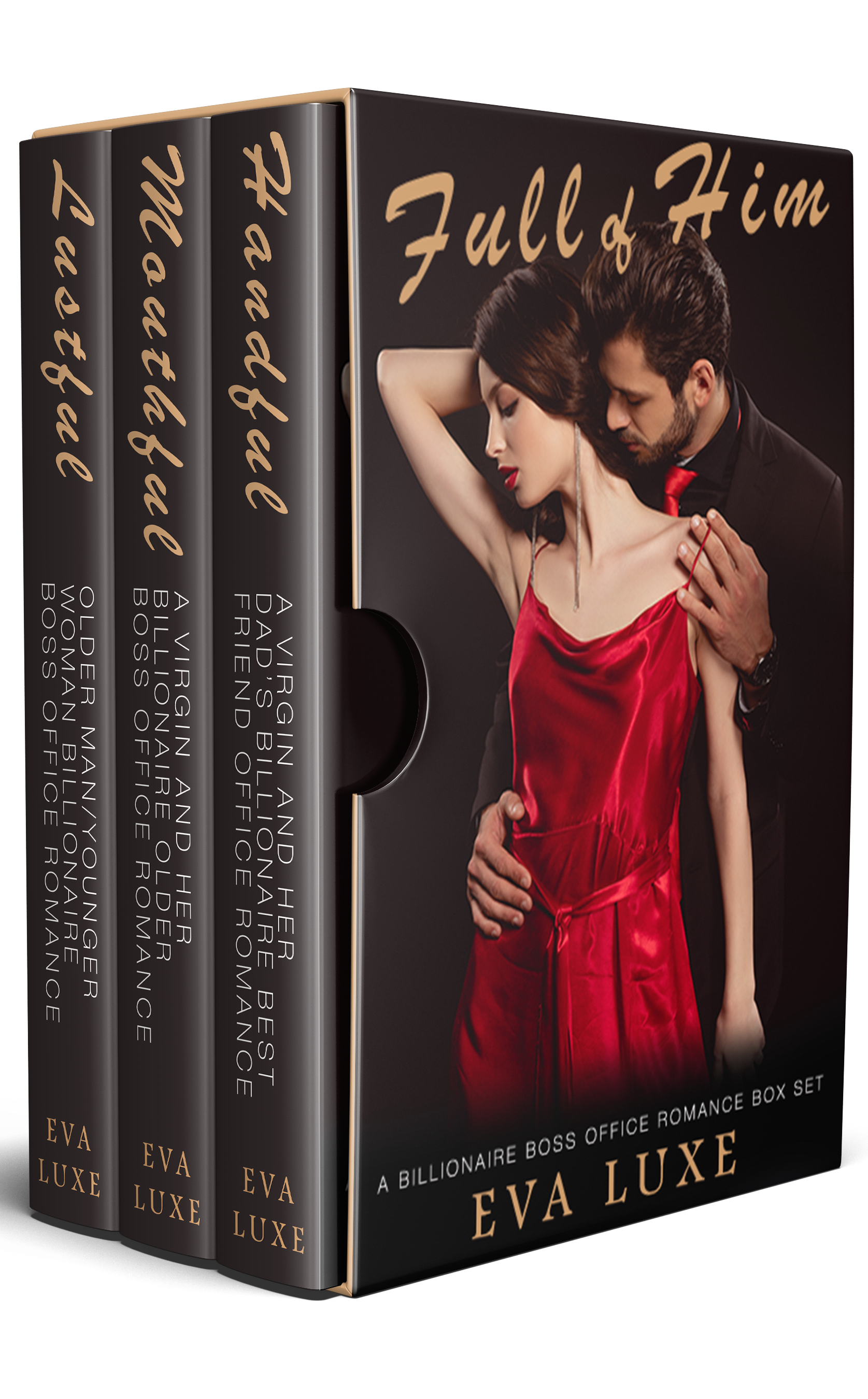 This box set contains three books in the Full series by Eva Luxe: Handful, Mouthful, and Lustful. They are standalones related by a billionaire and virgin, older man/younger woman office romance theme. They have no cheating, no cliffhanger, a very happily ever after and plenty of sizzling hot steam.