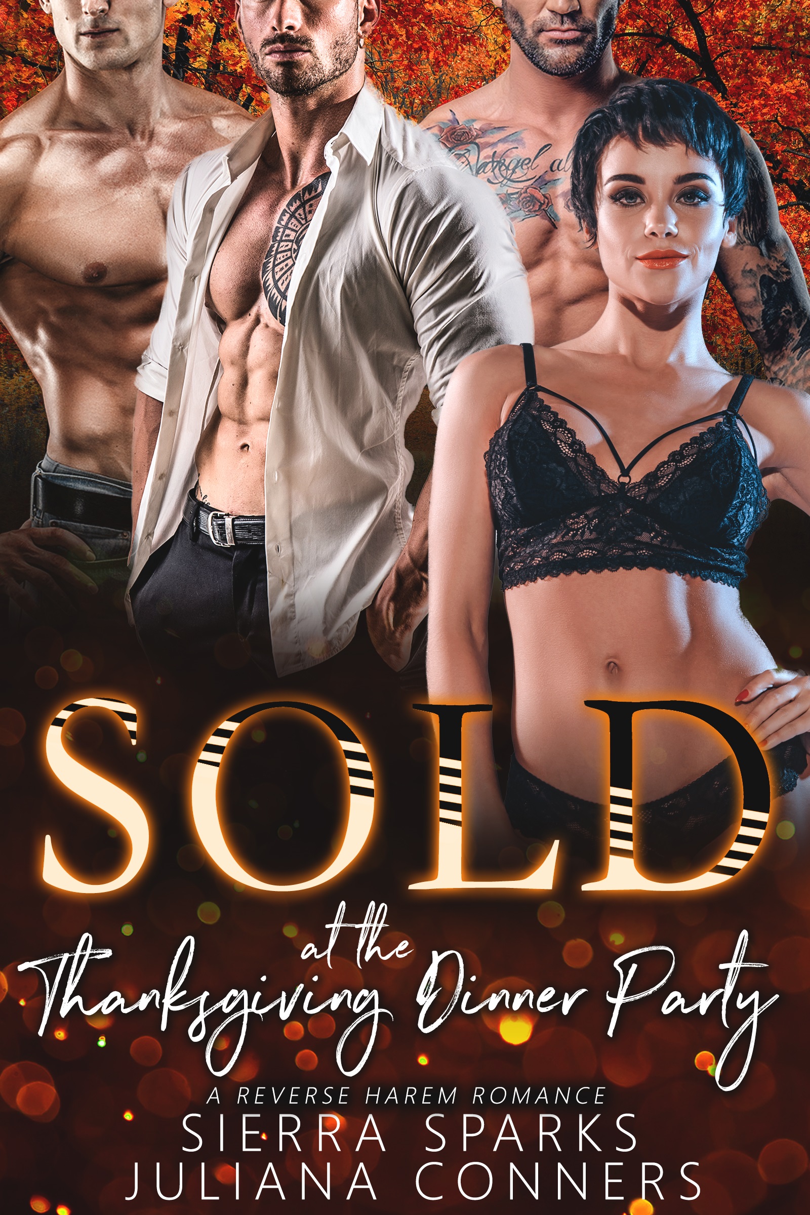 Sold at the Thanksgiving Dinner is a standalone reverse harem romance novella featuring all the kinky naughtiness you’ve come to know and love in a Sierra/Juliana collaboration. It features three men pleasing one lucky lady – no swords cross! It has a happy ever after, no cheating and no cliffhanger.